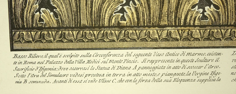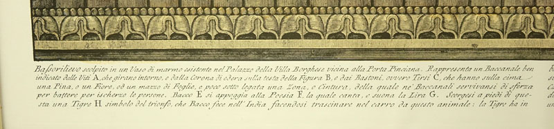 Two (2) Ornamental Frieze Engravings After Francesco Piranesi, Italian (born circa 1758-1810). Edizione Ponte Vecchio. Publisher's Fleur de lis blindstamp or otherwise unsigned. Laid down on foam board, framed. Wear and or rubbing to frame, minor buckling from humidity. Measures approx. 27" x 35-1/4", frames measure 32-1/2" x 38-1/2". Provenance: Collection from 2100 South Ocean Blvd, Palm Beach, Florida. A luxury condominium in the Historic Sloan's Curve Area of Palm Beach. Shipping: Third party. (estimate $50-$100)