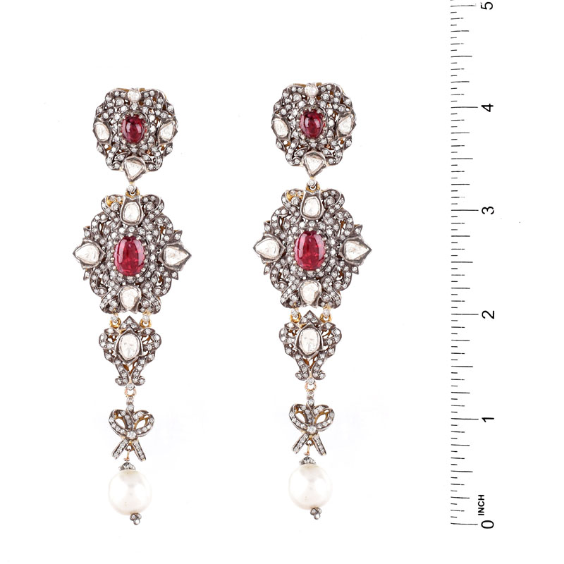 Large Vintage Table Cut Diamond, Cabochon Ruby, Pearl and Silver Topped 10 Karat Yellow Gold Chandelier Earrings. Larger rubies measure 9mm x 7.5mm. Pearls measure 10mm. Unsigned. Very good condition. Measure 4-1/8" L, 1-1/8" W. Approx. weight: 44.2 grams. Shipping $34.00 (estimate $4400-$5400)
