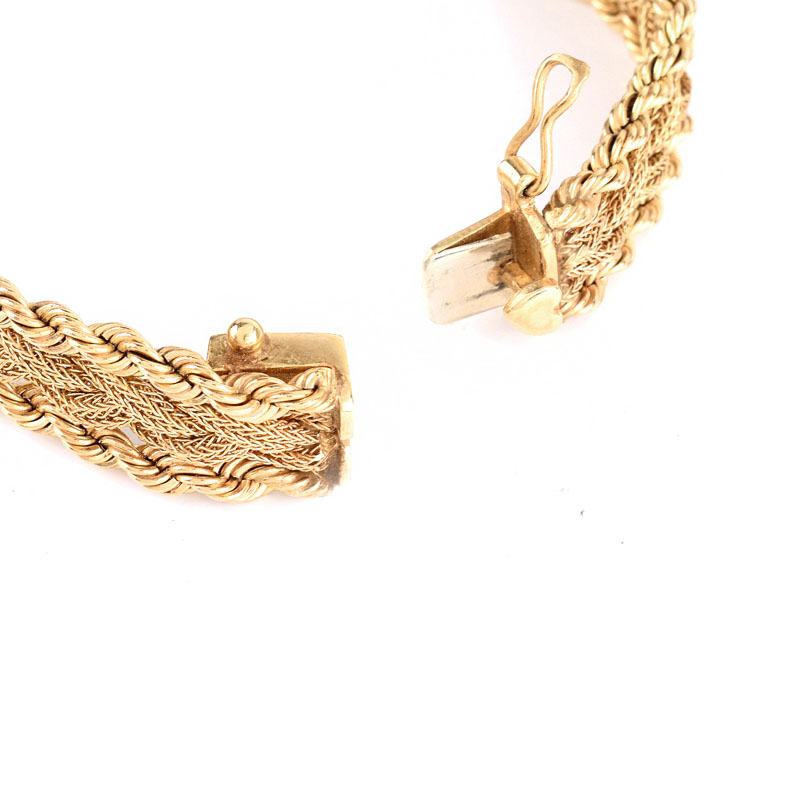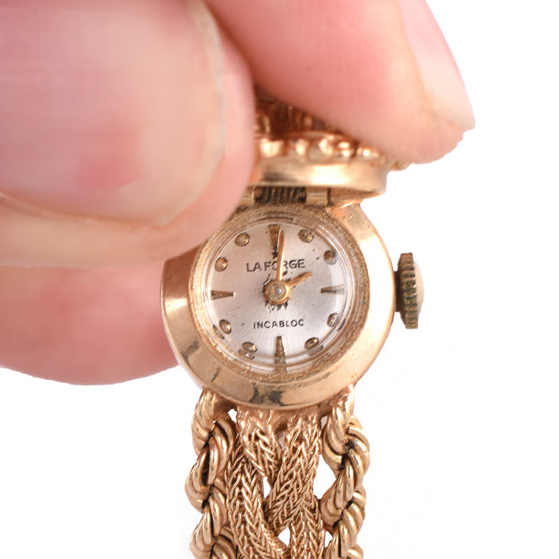 Lady's Vintage La Forge 14 Karat Yellow Gold and Opal Bracelet Watch. Signed, stamped 14K. Good vintage condition. Running. Please note the gallery does not warranty the running condition of watches. Case measures 15mm diam., bracelet measures 6" L. Approx. weight: 26.0 grams. Shipping $30.00 (estimate $650-$800)