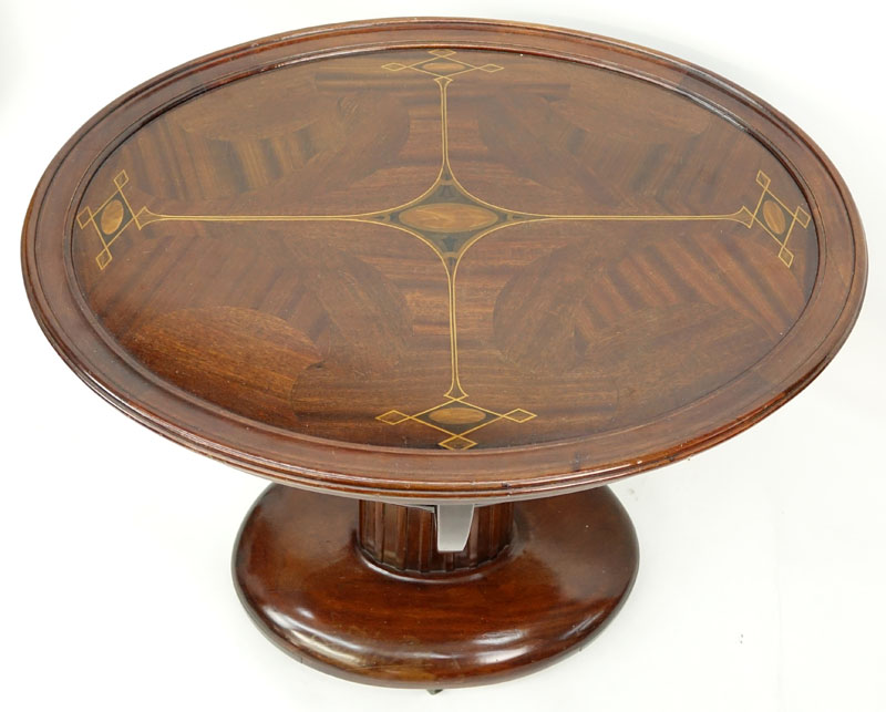 Antique Miller Cabinet Co. Mahogany Inlaid Oval Table on Wheels. Miller Cabinet Co., Rochester, N.Y. No. 999 label affixed to base. Wheels are not original to the table. Wear to veneer, scuff and scratches. Overall measures 33" H x 31-3/4" W x 23-3/4" Depth. Shipping: Third party. (estimate $200-$300)