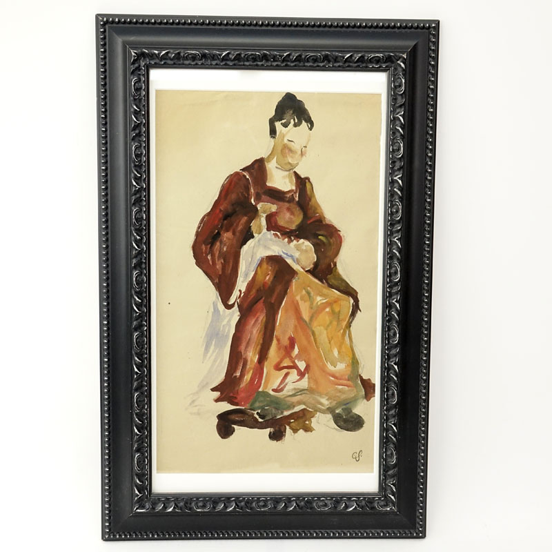 Carl Sprinchorn, American/Swedish (1887 - 1971) Pencil and watercolor on manila paper "Seated Woman" Initialed lower right. Light creases, tear upper right or in overall good condition. Measures 16" x 9" (sight), frame measures 22" x 14". Shipping $65.00 (estimate $300-$500)
