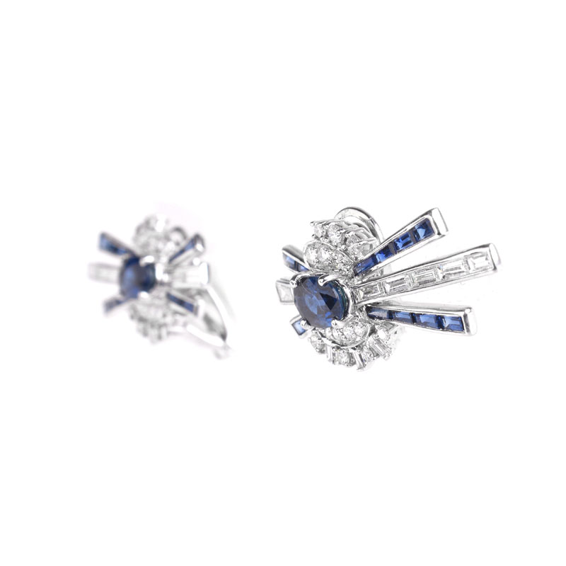 Approx. 3.60 Carat Oval and Baguette Cut Sapphire, 1.40 Carat Round Brilliant and Baguette Cut Diamond and Platinum Earrings. Stamped Plat. Very good condition. Measure 1-1/8" x 9/16". Approx. weight: 11.7 grams. Shipping $30.00 (estimate $3500-$5500)