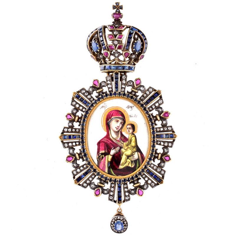 19/20th Century Russian 56 Yellow Gold (14 Karat) Sapphire, Ruby, Rose Cut Diamond and Enamel Icon-Panagia with Presentation Box bearing the Russian Imperial Eagle.