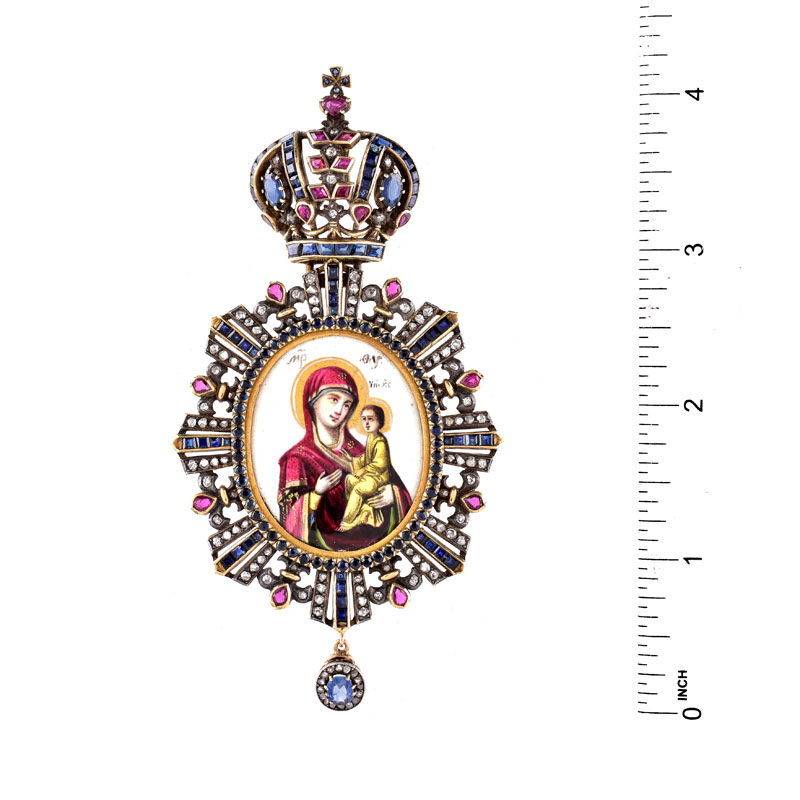 19/20th Century Russian 56 Yellow Gold (14 Karat) Sapphire, Ruby, Rose Cut Diamond and Enamel Icon-Panagia with Presentation Box bearing the Russian Imperial Eagle. The enamel plaque depicts a finely painted image of the Madonna and Christ child. To the verso is a finely engraved image of the cruxifiction and the initials ??. Stamped ?.?, 56 gold mark. Very good condition. Measures 4-1/4" L, 2-1/8" W. Approx. weight: 53.2 grams. Shipping $36.00 (estimate $10000-$15000)