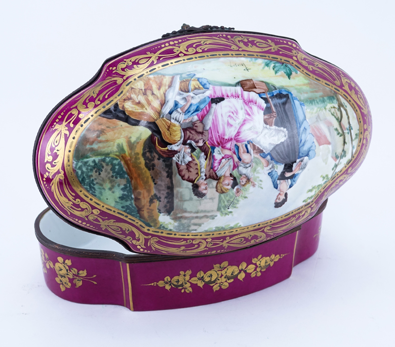 Very Large Handpainted Sevres Porcelain Box. Decorated with a figural scene.