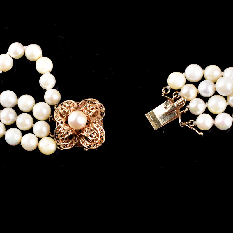 Vintage Four Strand 8mm White Pearl and 14 Karat Yellow Gold Necklace. Stamped 14K to clasp, Pearls with good polish and luster.