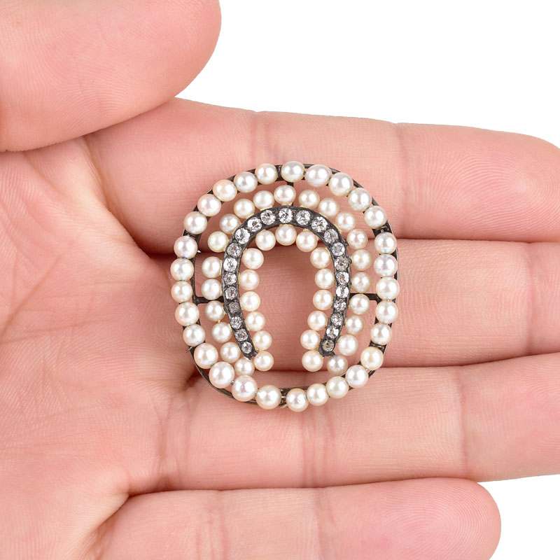 Antique Pearl, Diamond and 14 Karat White Gold Horse Shoe Brooch. Unsigned.