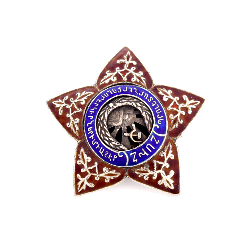 Russian / Armenian Circa 1921 Soviet Era 84 Silver Badge of the Star of Armenia in Presentation Box. Together with "Awards of Armenia 1918-1939" catalog. Very good condition. Measures 2" H, 2" W. Approx. weight: 30.1 grams. [This badge was sold to Sergey Golubitsky, username: lida-koshkareva of Russia in Kodner 4/4/18 auction. The bidder has failed to respond to our emails and phone contacts and has made no effort to pay. It appears it was a fraudulent bid.] Shipping $32.00 (estimate $700-$1400)
