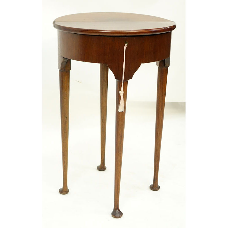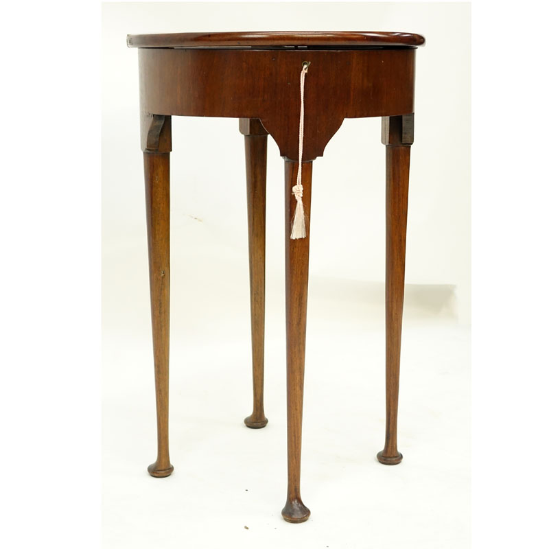 Antique English Queen Anne Style Carved Walnut Half Moon Folding Table. Key included. Rubbing and scuffs to feet overall good condition. Measures 27-3/4" H x 18" W, 17-5/8" Dia at the top when open. Shipping: Third party. (estimate $150-$250)