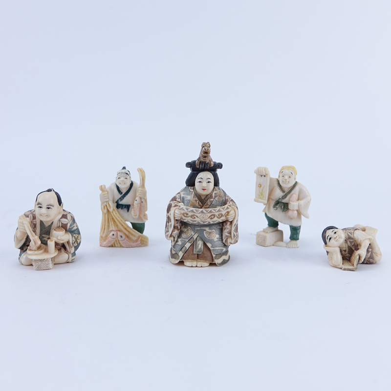 Collection of Five (5) Carved Japanese Ivory Netsuke. Some signed. Good condition. Measures approx. 1-1/2" - 2-3/4". We Will Not Ship This Item Out of State of Florida. Anyone Having This Item Shipped Must Have a Florida Address or the Item will not be Shipped. We will Not Knowingly Sell Endangered Species outside of Legal Channels. Shipping $35.00 (estimate $200-$300)