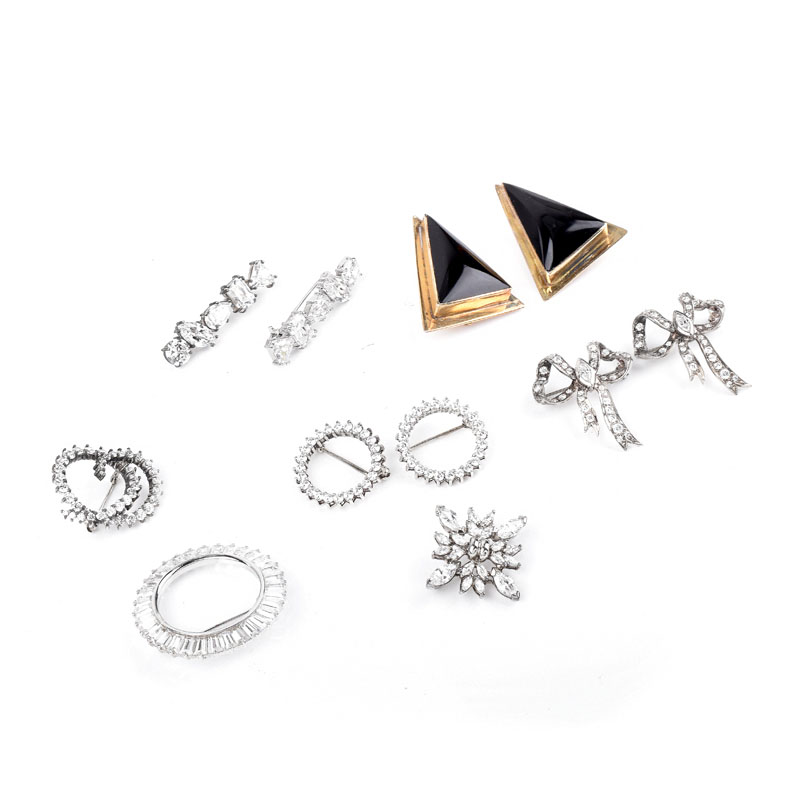 Collection of Sterling Silver Jewelry Including Nine (9) Brooches with Faux Diamonds and a Pair of Earrings.