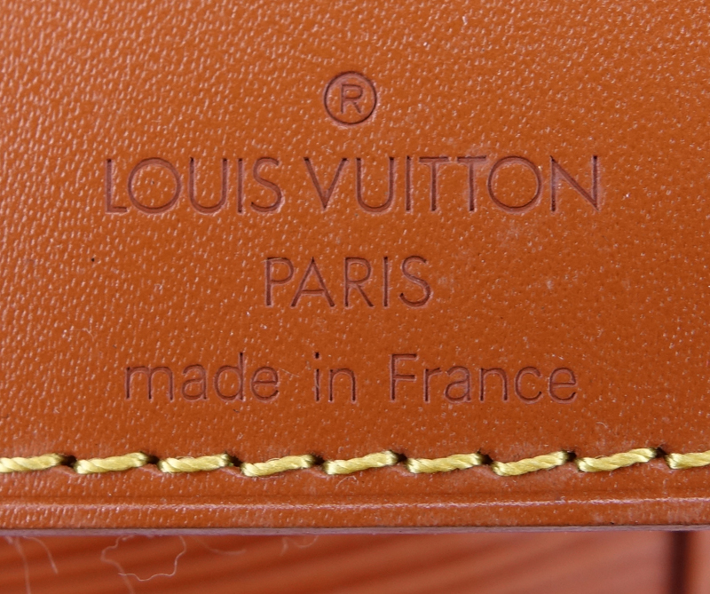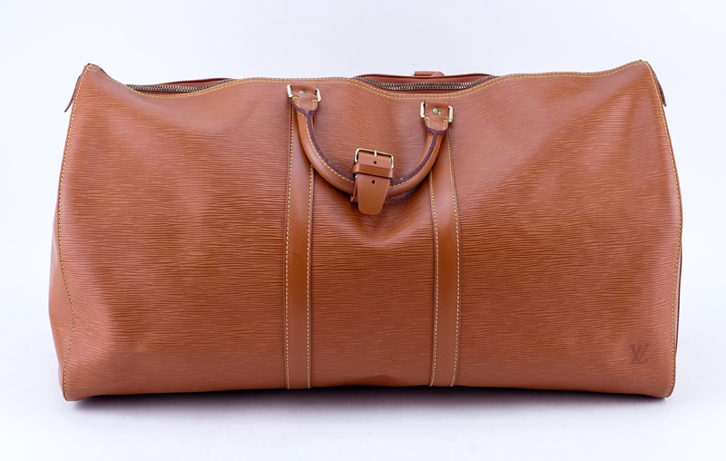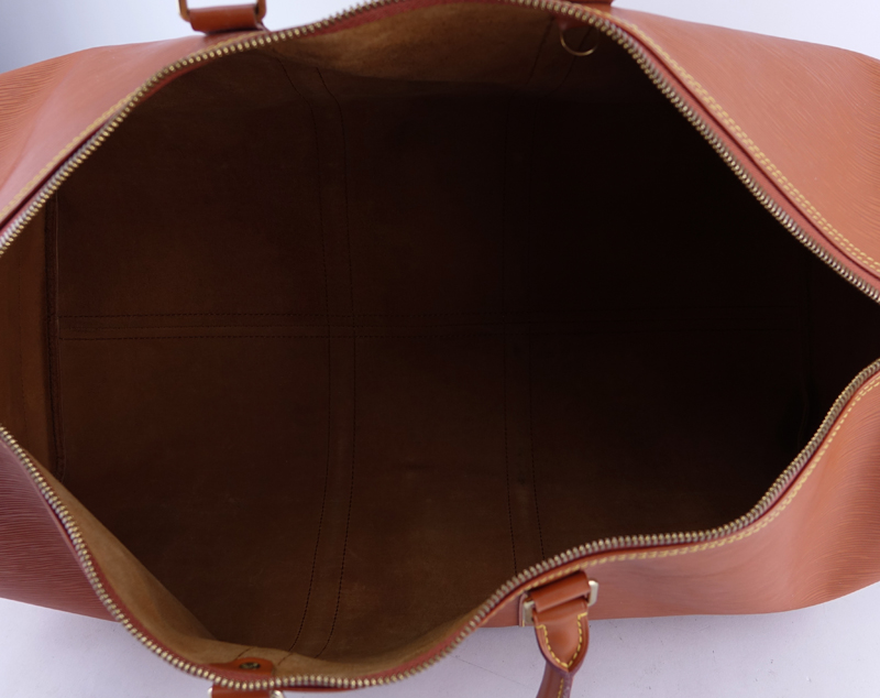 Louis Vuitton Gold Epi Leather Keepall Travel Bag 55. Golden brass hardware. Leather interior. Outside pocket. Luggage tag. Labeled appropriately. Very good condition with only slight signs of wear. Measures 22-1/2" L x 12" H x 10" D. Shipping $95.00 (estimate $450-$550)