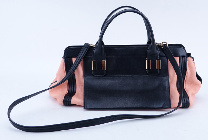 Chloe Peach Pink/Black Smooth Leather Alice MM Handbag. Gold tone hardware, the interior of black fabric with zippered pocket, shoulder strap included. Labeled appropriately. Serial # 03-13-50-65. Good condition with wear at bottom corners, edges.