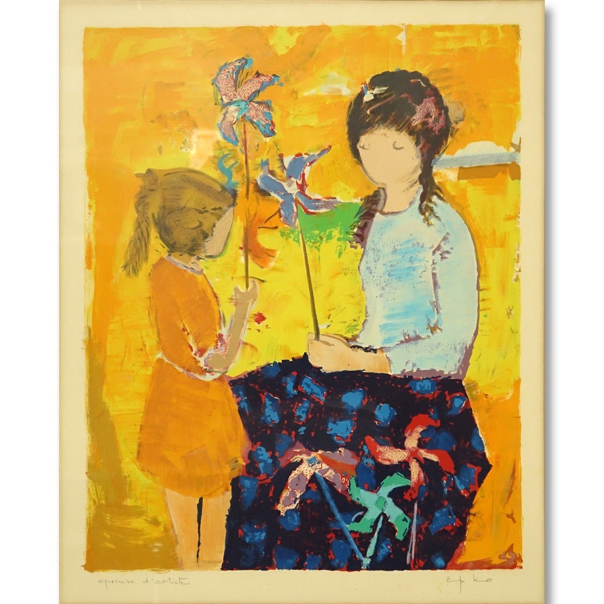 Willering Epko, French (born 1928) Color lithograph "Marchande de Jouets" Signed, "Epreuve D'Artiste" in pencil. Toning from age. Measures 24-1/2" x 19-1/2" (sight), frame measures 32" x 26-1/2". Shipping: Third party. (estimate $100-$200)