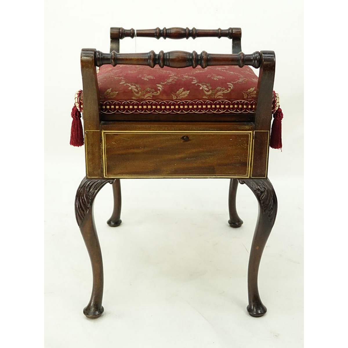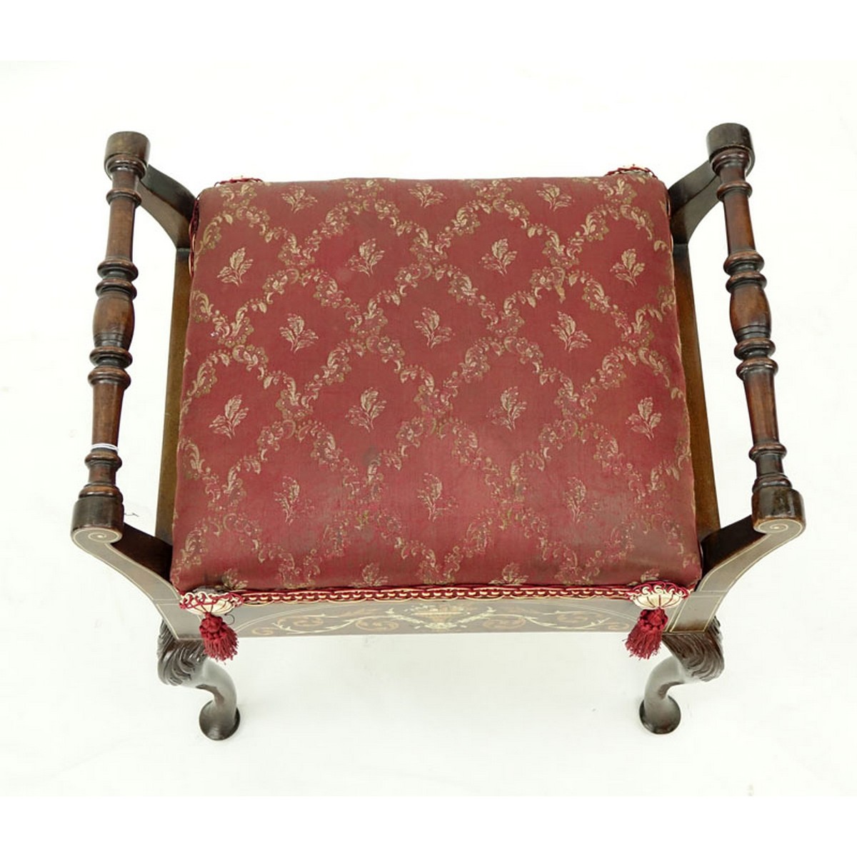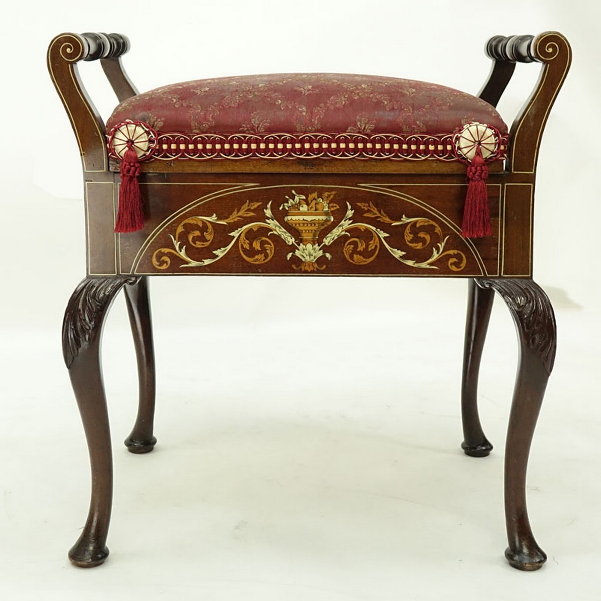 Antique Queen Anne Style Painted and Inlaid Upholstered Bench. Rubbing to varnish, split to wood on one side, light scratches to wood. Measures 23" H x 21-1/2" W x 14" D. Shipping: third party. (estimate $100-$150)