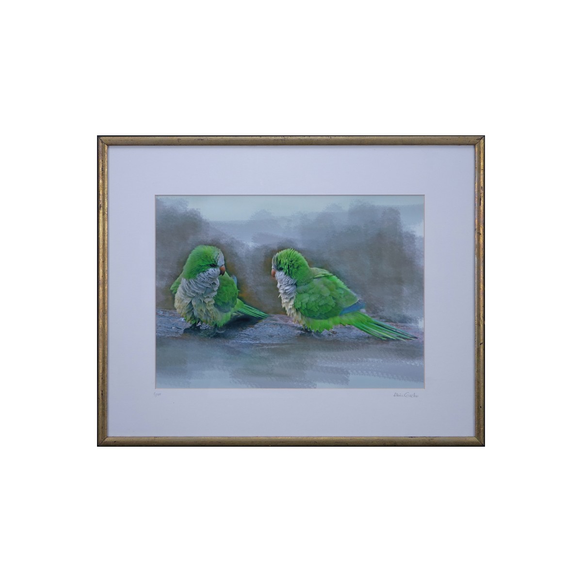 Alice Greko (20th C.) Photo and Digital Paintbrush "Florida Parrots" Signed and Numbered 3/40 in Pencil. Good condition. Measures 10-1/2" H x 14-1/2" W (sight), frame measures 16-7/8" H x 20-7/8" W. Shipping $95.00 (estimate $50-$100)