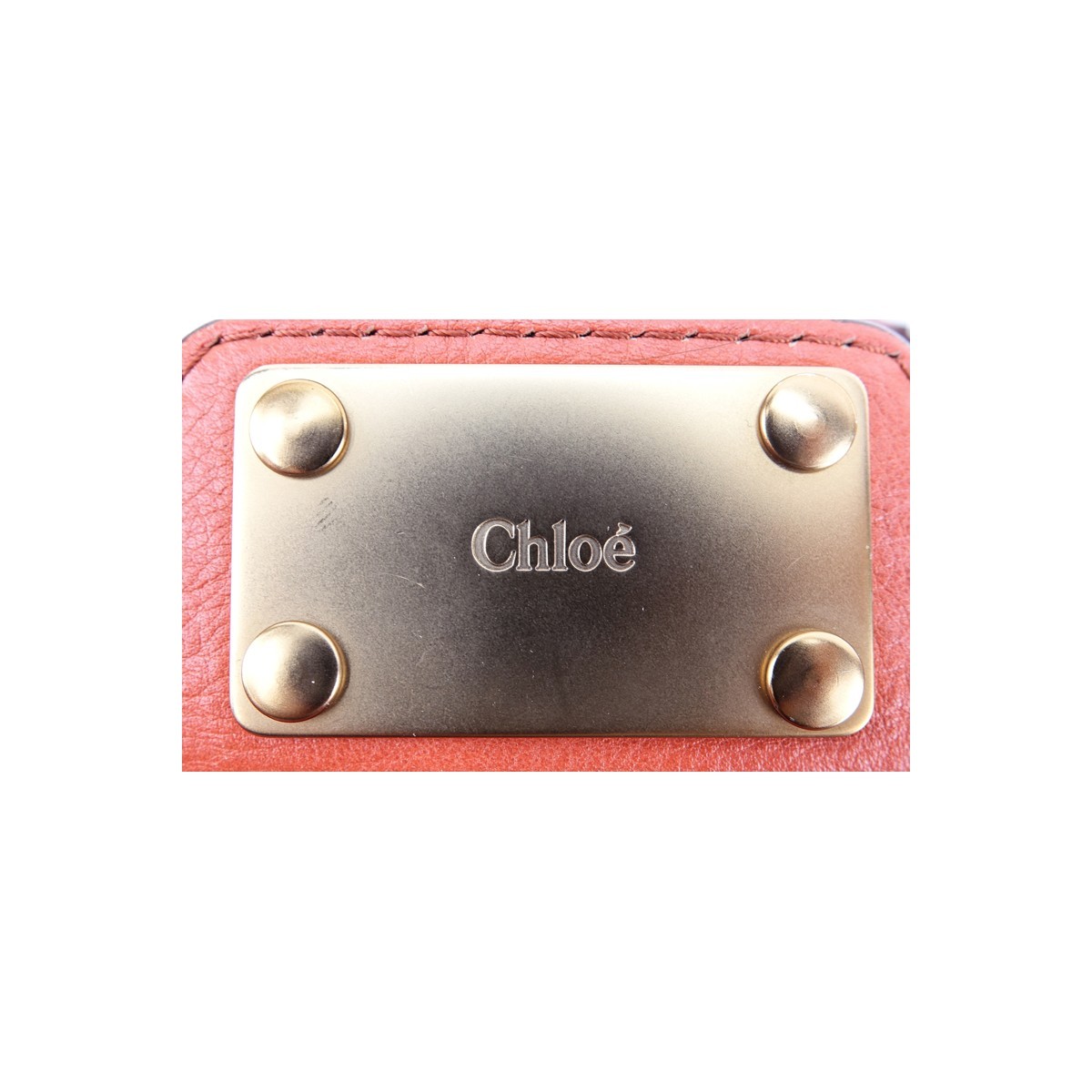 Chloe Dark Orange Grained Leather Paddington MM Handbag. Brushed gold tone hardware, beige fabric interior with zippered and patch pockets.