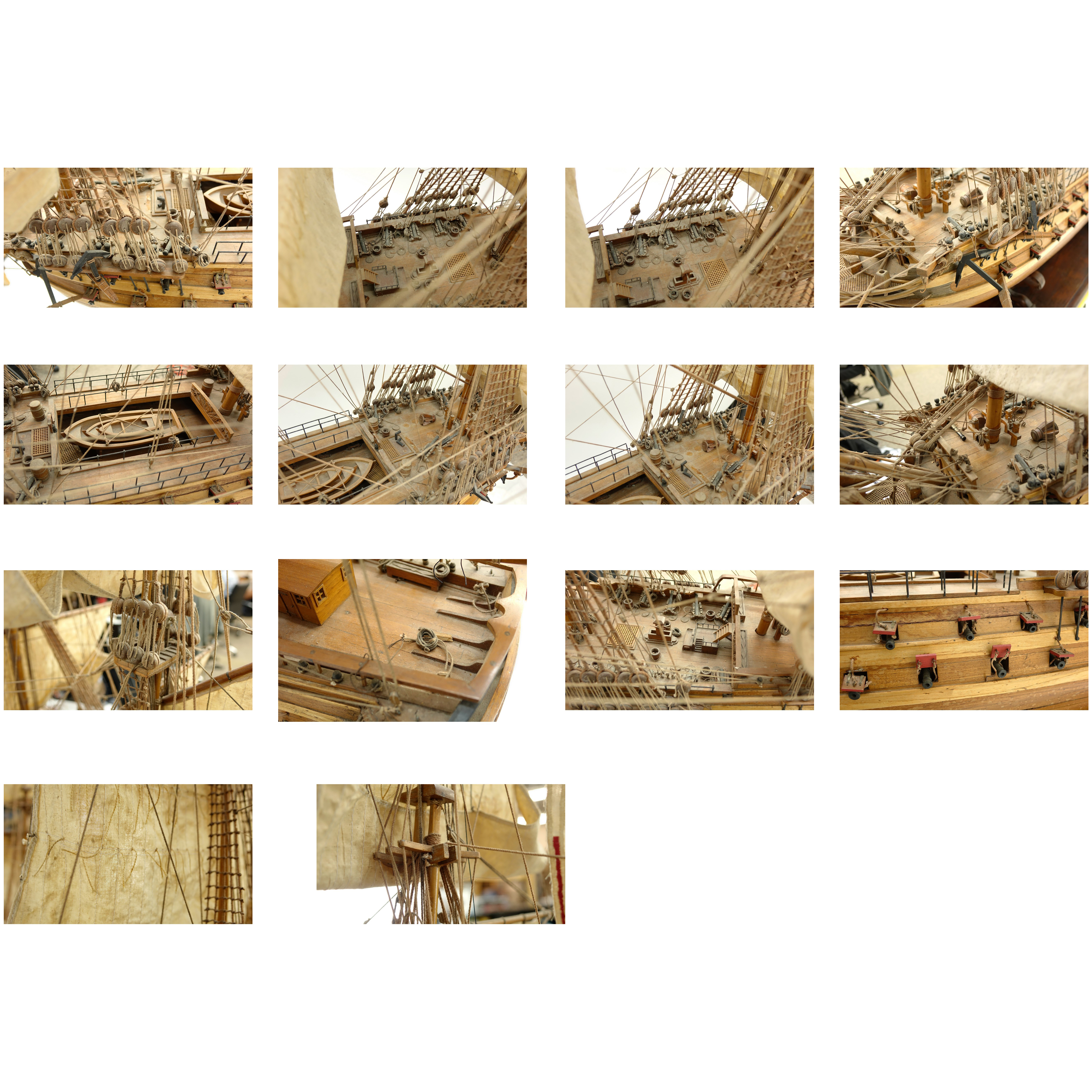 Antique French Wood Model Sailing Ship On Figural Stand. Well done and extremely detailed. With three masts, very intricate rigging, cannons, life boat, numerous decks, cloth sails, French flags. Unsigned. Some loose parts or in overall good condition. Measures approx. 52" H x 50" L. Shipping: Third party. (estimate $5000-$7000)