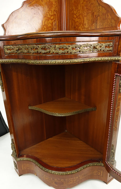 20th Century Louis XVI Style Mahogany Floral Inlaid, Bronze Mounted Corner Cabinet. Serpentine form with single fitted drawer and glass door, gallerie gate to top and interior shelves, figural mounts flaking the corners.