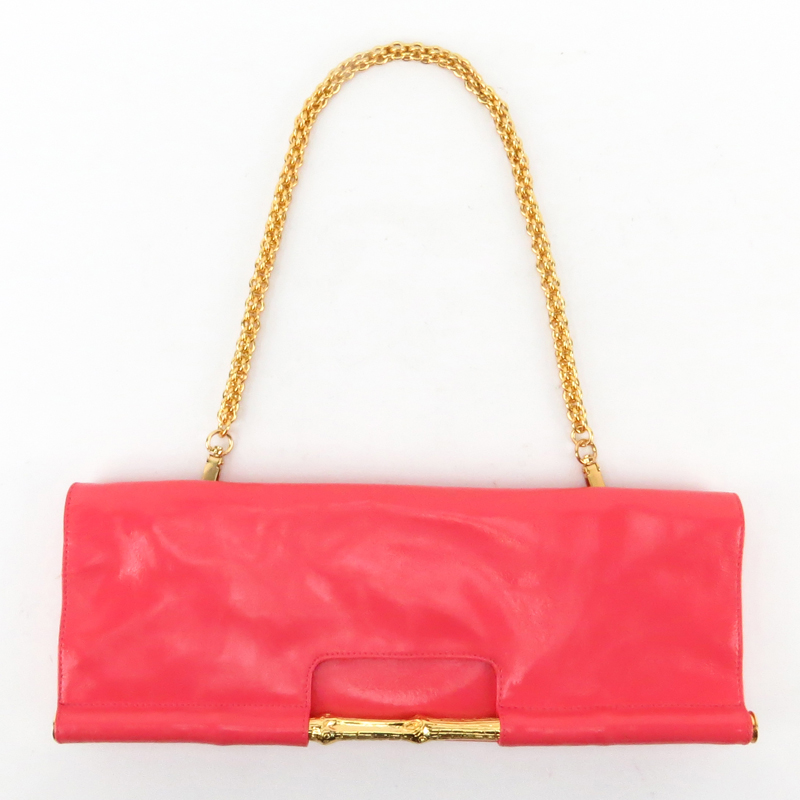 Trina Turk Salmon Pink Patent Leather Clutch. Gold-tone hardware and shoulder chain.