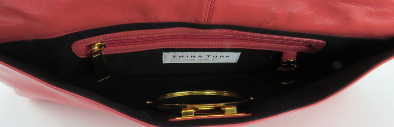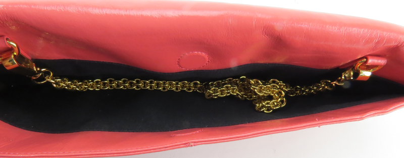 Trina Turk Salmon Pink Patent Leather Clutch. Gold-tone hardware and shoulder chain. Magnetic closure, interior zipper pocket and attached mirror. Outside pocket, cloth interior. Gently used condition with discoloration inside flap. Measures 6" H x 15" L x 1-14" D. Dust bag included. Shipping $58.00 (estimate $200-$300)