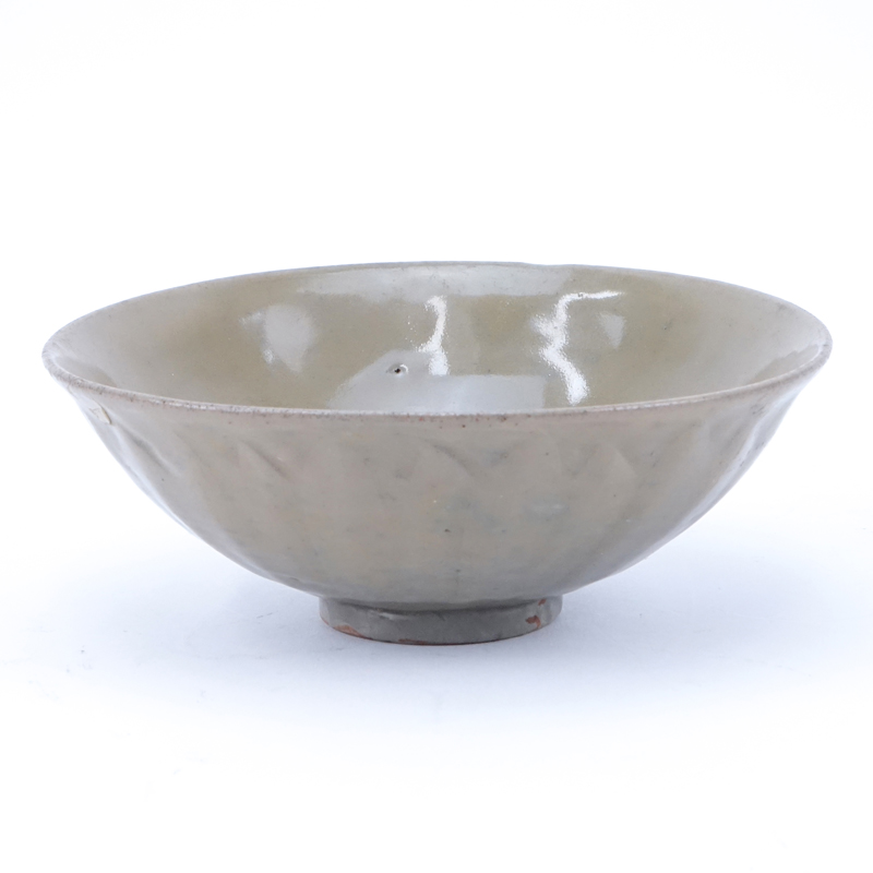 Chinese Song Dynasty or After Celadon Bowl. Impressed mark center bowl, lotus petals motif on outer surface. Wear consistent with age, rubbing, nicks, and cracks. Measures 2-1/2" H x 6-3/4" Dia. Shipping $52.00 (estimate $150-$250)