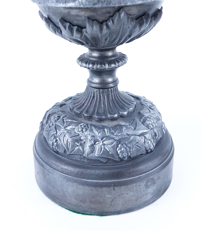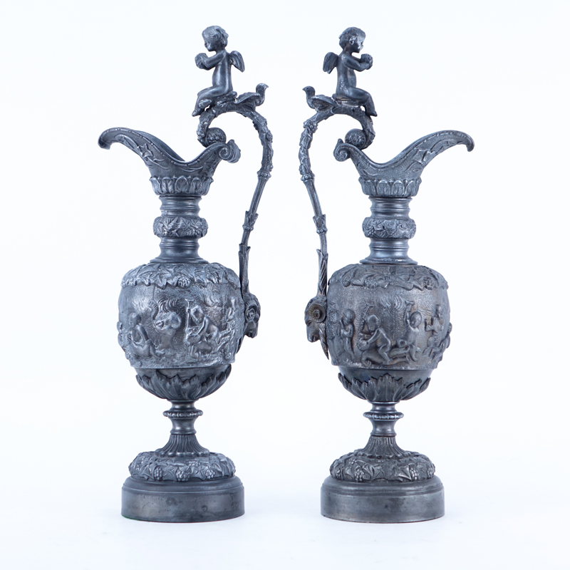 Pair of 20th Century Neoclassical Style Metal Ewers with Bacchanalian scenes. Rubbing otherwise good condition. Measures 16-1/4" H. Shipping $88.00 (estimate $100-$200)