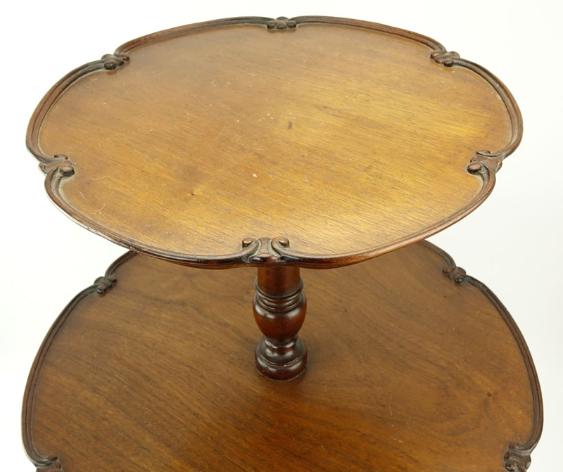 Mid Century Chippendale Style Two tiered Pie Crust Table. Decorated with scalloped edges and three cabriole style legs.