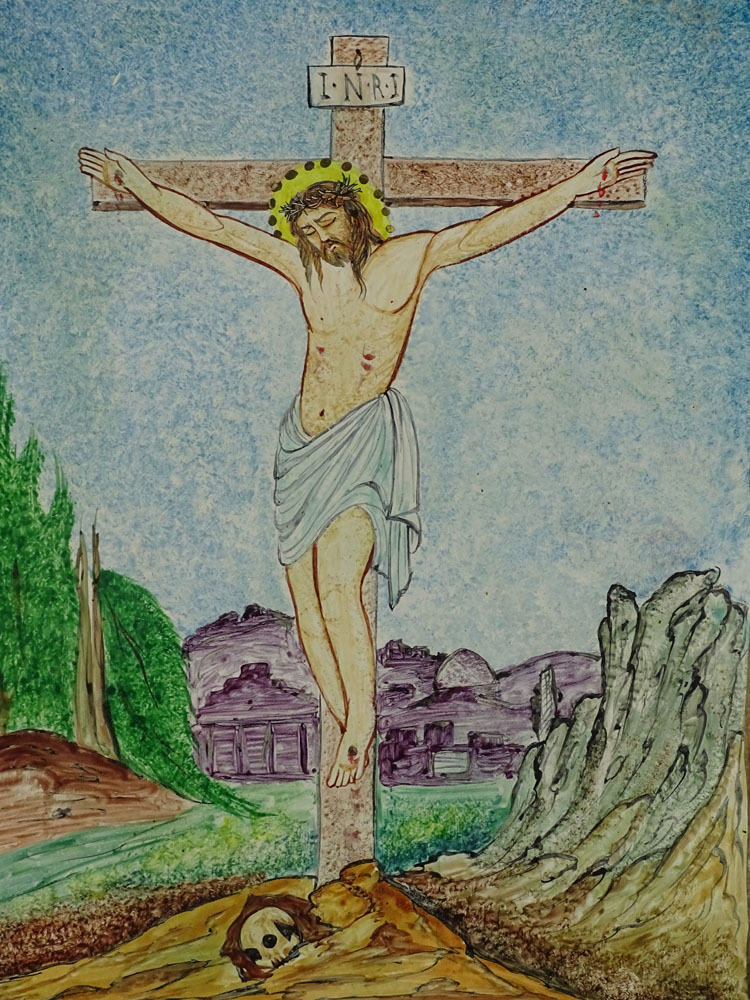 Vintage Enamel on Copper Plaque "The Crucifixion of Jesus" Unsigned. Small Loss Upper Left Corner.