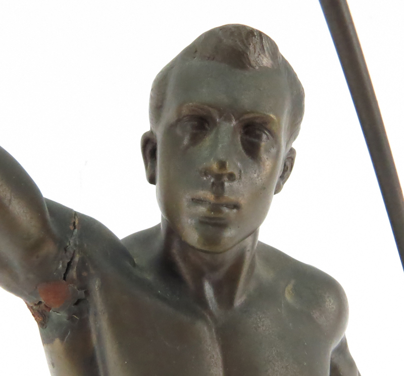 Oskar Bodin, German (1868-1940) "Model of a Fencer" Bronze Sculpture on Marble Base. Signed on underside. Restoration to one arm, rubbing to gilt, small nick to marble. Measures 17-1/4" H. Shipping $76.00 (estimate $50-$100)