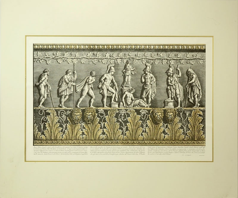 Two (2) Ornamental Frieze Engravings After Francesco Piranesi, Italian (born circa 1758-1810). Edizione Ponte Vecchio. Publisher's Fleur de lis blindstamp or otherwise unsigned. Laid down on foam board, framed. Wear and or rubbing to frame, minor buckling from humidity. Measures approx. 27" x 35-1/4", frames measure 32-1/2" x 38-1/2". Provenance: Collection from 2100 South Ocean Blvd, Palm Beach, Florida. A luxury condominium in the Historic Sloan's Curve Area of Palm Beach. Shipping: Third party. (estimate $25-$50)