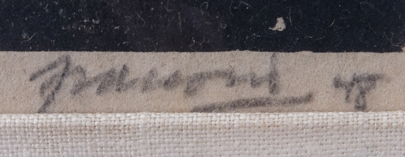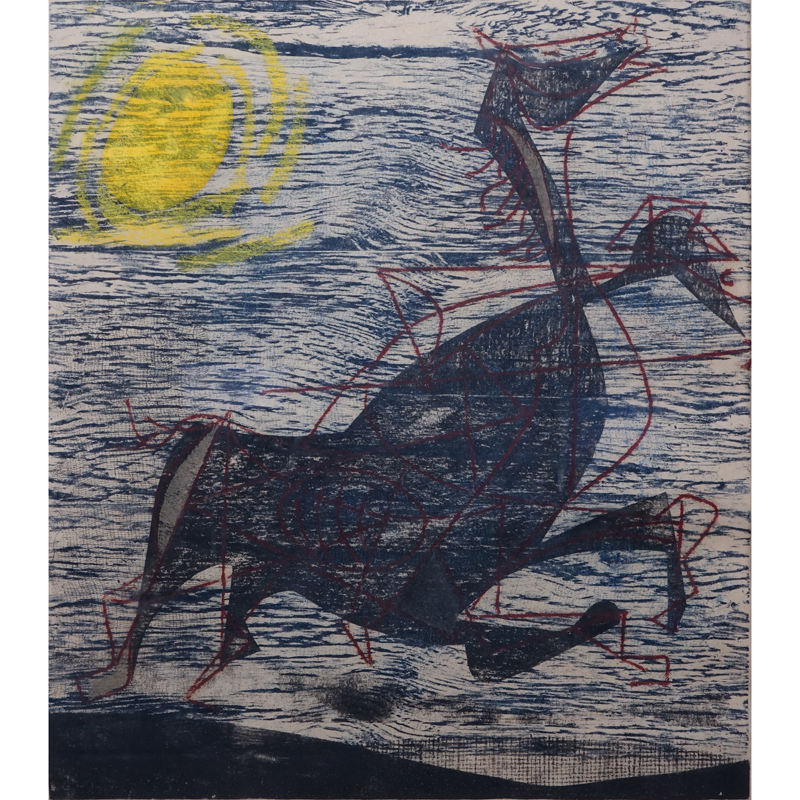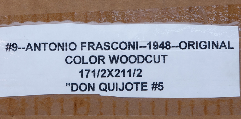 Antonio Frasconi, Argentine (b. 1919) Original color woodcut "Don Quijote #5". Titled, signed, dated '48 in pencil. Label en verso. Toning from age. Measures 21-1/2" x 18" (sight), frame measures 29-1/4" x 25-1/4". Shipping: Third party. (estimate $250-$350)