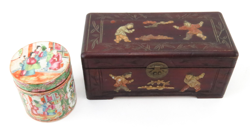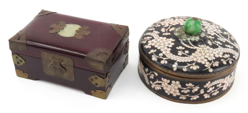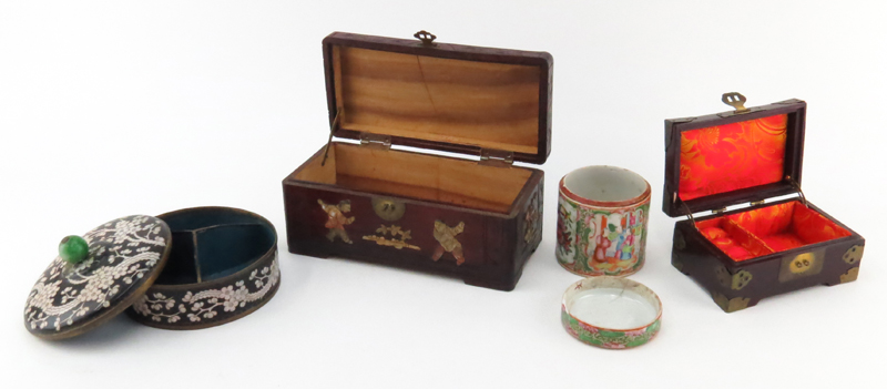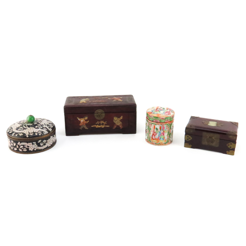 Collection of Four (4) Chinese Boxes. Includes: Two hardstone inlaid boxes, cloisonné round box, and porcelain covered box. Wear to enamel on cloisonné box, porcelain box has some chips. Largest measures 4-7/8" H x 10-1/2" W. Shipping $66.00 (estimate $25-$50)