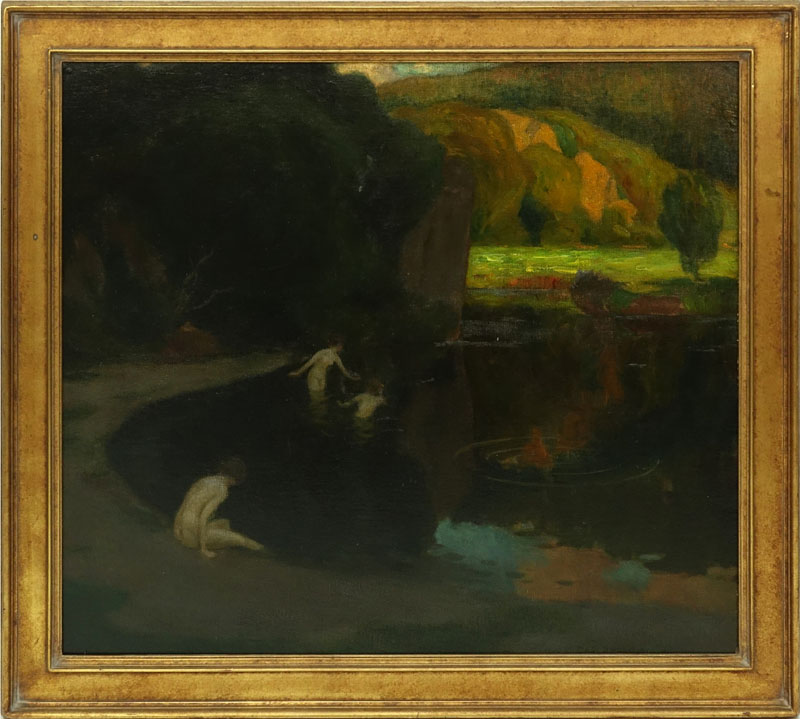 Karl Johann Nikolaus Piepho, Germany (1869 - 1920) Oil on canvas laid down on masonite "The Bathers" Signed lower right, label en verso. Two tiny abrasions or good overall condition. Measures 31-1/2" x 36", frame measures 37-5/8" x 41-7/8". Shipping: Third party. (estimate $300-$500)