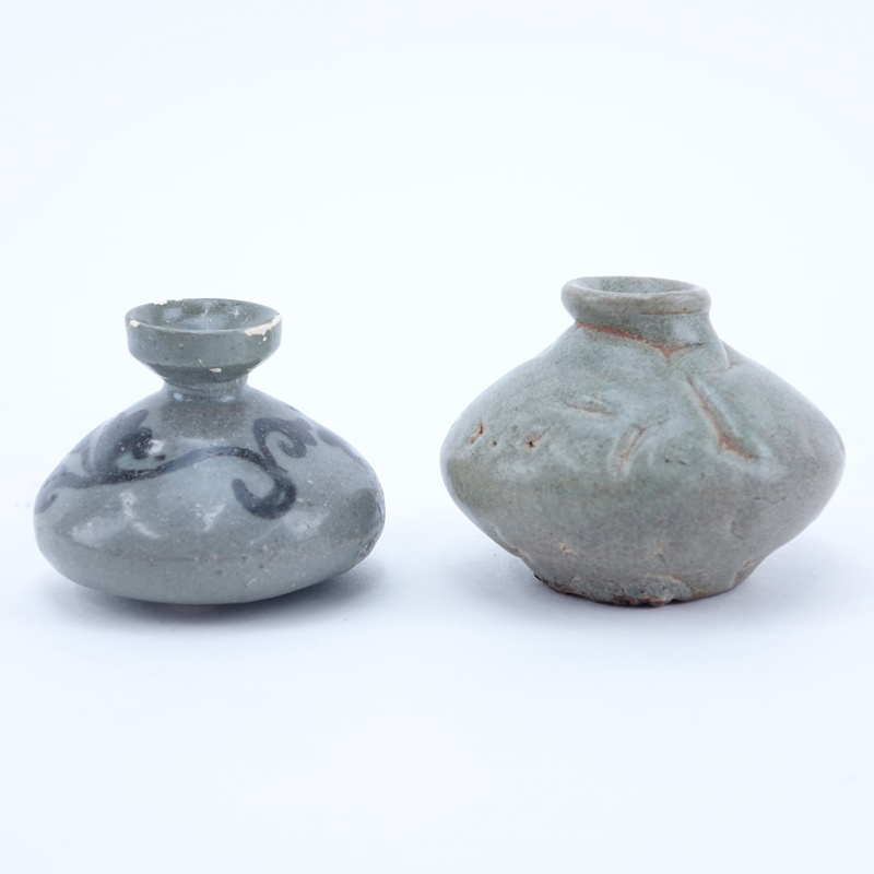Two (2) Chinese Goryeo Dynasty, 12th - 14th Century Celadon Glazed Oil Bottles. One decorated in black slip with two leafy sprigs; the other covered with a crackled glaze.