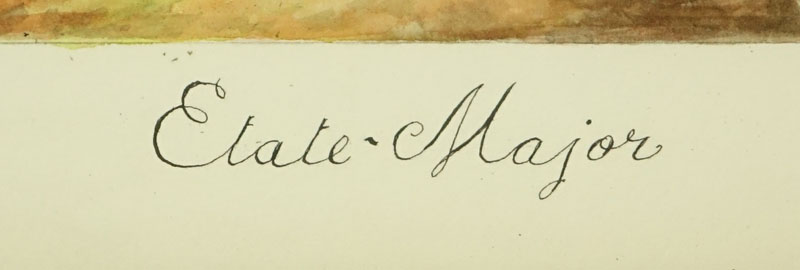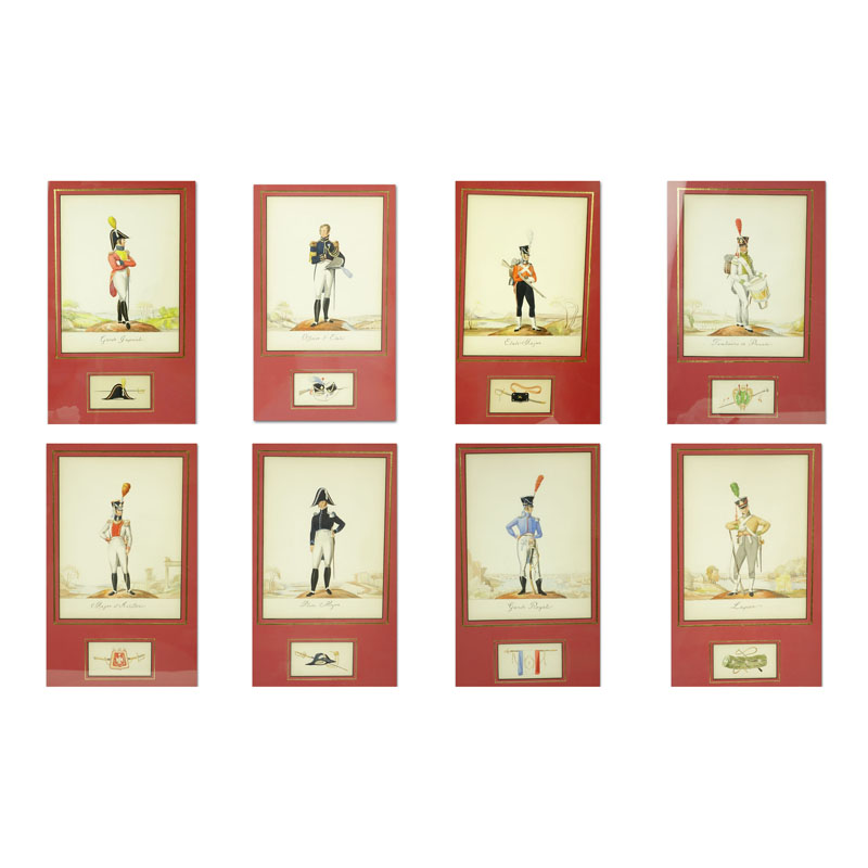 Collection of Eight (8) 19th Century French Military Gouache On Paper Paintings. Includes portraits of various officers: Etat Major, Garde Imperiale Lapeur, Garde Royale, Place Major, Major d'Artillier, Tambours en Parade, Officier d' Etat. Unsigned. Light toning from age, laid down or in good condition. Portraits measure 12-1/8" x 9", frames measures 23" x 15". Shipping: Third party (estimate $900-$1100)