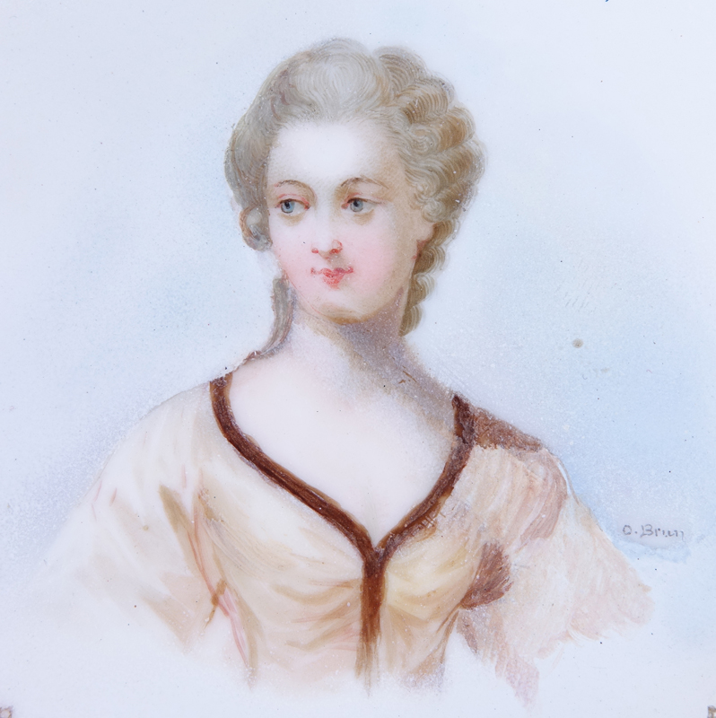 Pair of 19/20th Century Sevres Porcelain Cabinet Plates, Chateau de Tuileries Rose Pompadour and Gilt Hand painted Cabinet Plates. Features a portrait of Madame Recamier and another of Madame de Créquy?.