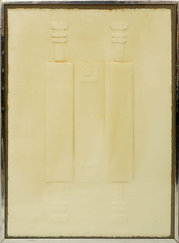 Omar Vayo, Israeli (20th Century) Intaglio on deckled paper "Torah". Pencil signed and numbered 26/50. Toning and light foxing from age. Measures 30-1/2" x 22", frame measures 32-5/8" x 24". Shipping: Third party. (estimate $400-$600)