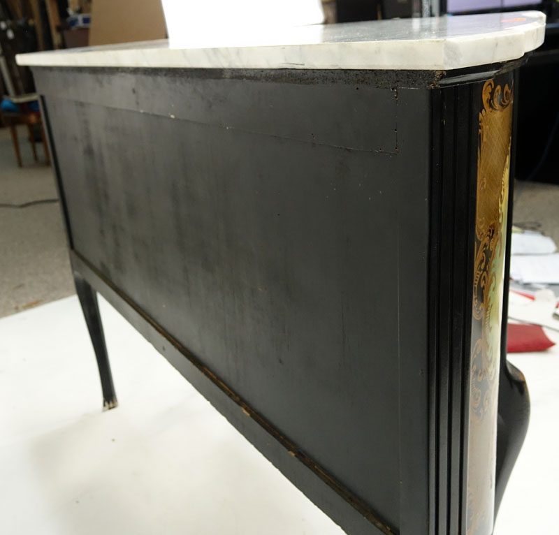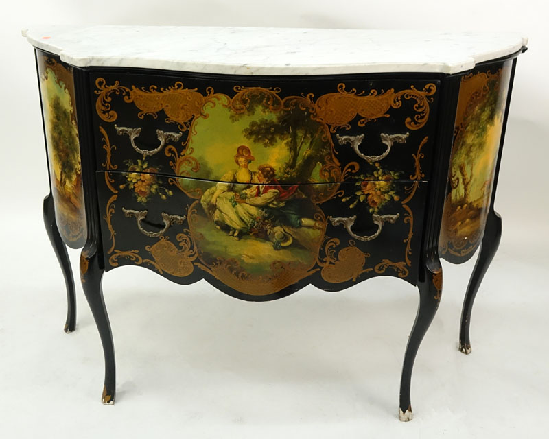 20th Century Louis XV Style and Vernis Martin Style Black Lacquer and Gilt Marble Top Commode. Two fitted drawers with gilt brass handles, standing on cabriole legs, with courting scene painted front and outdoor scene flanked at the sides. Wear to lacquer at the base of the legs otherwise normal rubbing to surface. Measures 33-1/4" H x 45" W x 16" Depth. Shipping: Third party. (estimate $350-$5500)