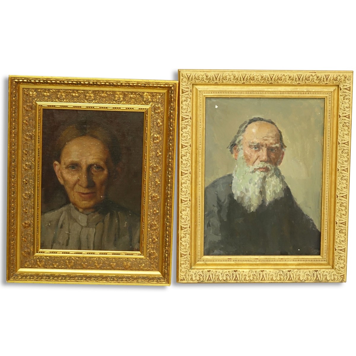 Grouping Two (2): Vintage Oil On Board Of An Elderly Male, Antique Oil On Canvas Of A Elderly Woman. Oil On Canvas Is Signed Lower Right, Other Is Unsigned. Largest Frame Measures 20-1/2" H X 16-1/2" W (male), Smallest Measures 19-1/2" H X 15-1/2" W (woman). Domestic Shipping: $145.00
