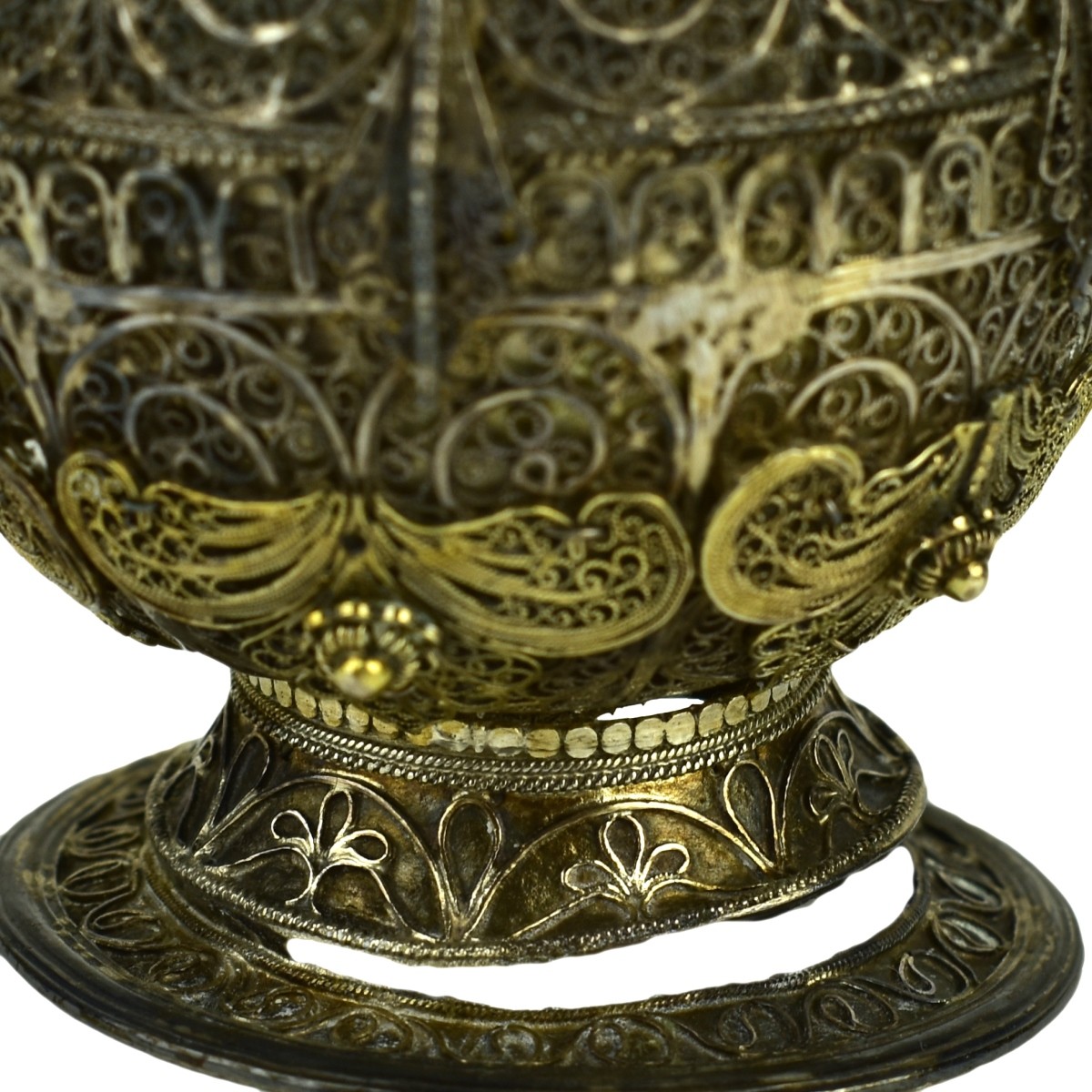 Five (5) Piece Judaica Lot. Includes: Menorah, 3 spice holders, small Tiffany sterling cup. Menorah measures 6-1/2" H x 6" W. Domestic Shipping: $56.00 Min Est. $50.00 Max Est. $100.00 Condition: Wear, losses "as is".