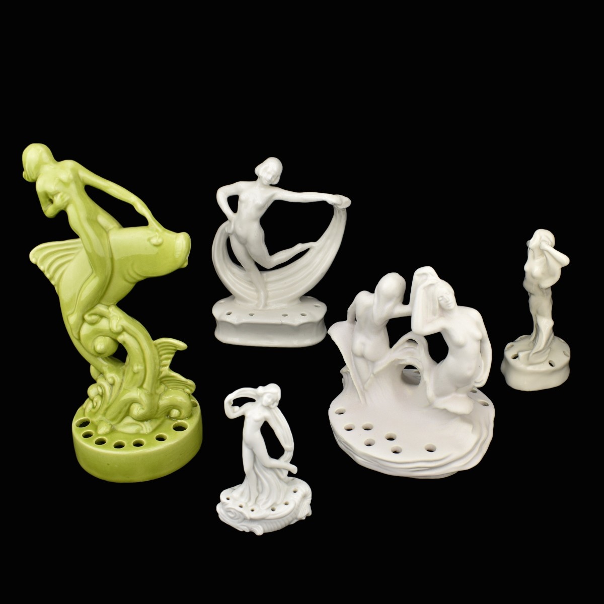 Five (5) Art Deco Porcelain & Pottery Flower Frogs