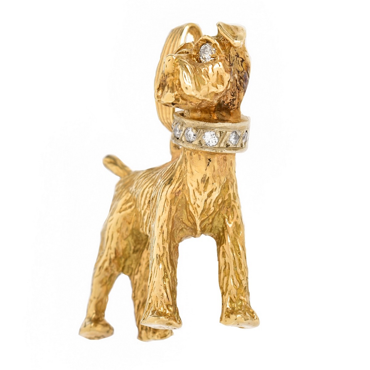 Vintage 14 Karat Yellow Gold and Diamond Dog Pendant. Stamped 14K. Measures 1-1/4" H, 1-1/8" L. Approx. weight: 22.8 grams. Domestic Shipping: $28.00 Min Est. $600.00 Max Est. $800.00 Condition: Very good condition.