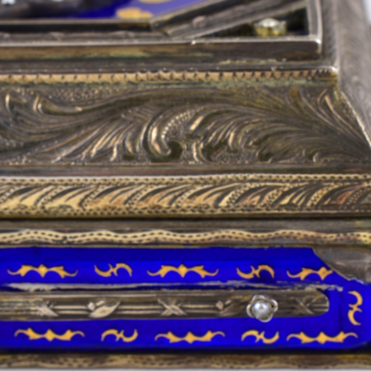 Antique silver, enamel jeweled box. Possibly American. Wood lined. The box set with seed pearls, emeralds, rubies. Signed 925 Sterling. Measures 1-1/2" H x 5" L x 3-1/4" D. Domestic Shipping: $56.00 Min Est. $400.00 Max Est. $600.00 Condition: Losses to enamel, glue residue on bottom.