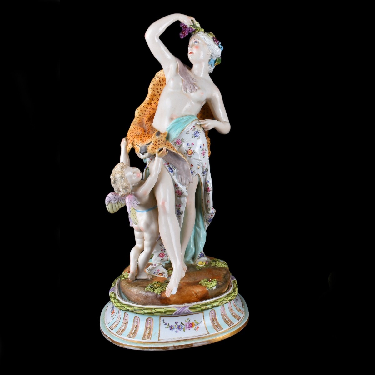 Impressive Pair of Meissen Porcelain Figural Group on Matching Bases. Crossed sword mark beneath the figures and base. Largest measures 18-3/4" H (with base), measures 16" H (without base). Domestic Shipping: Third party