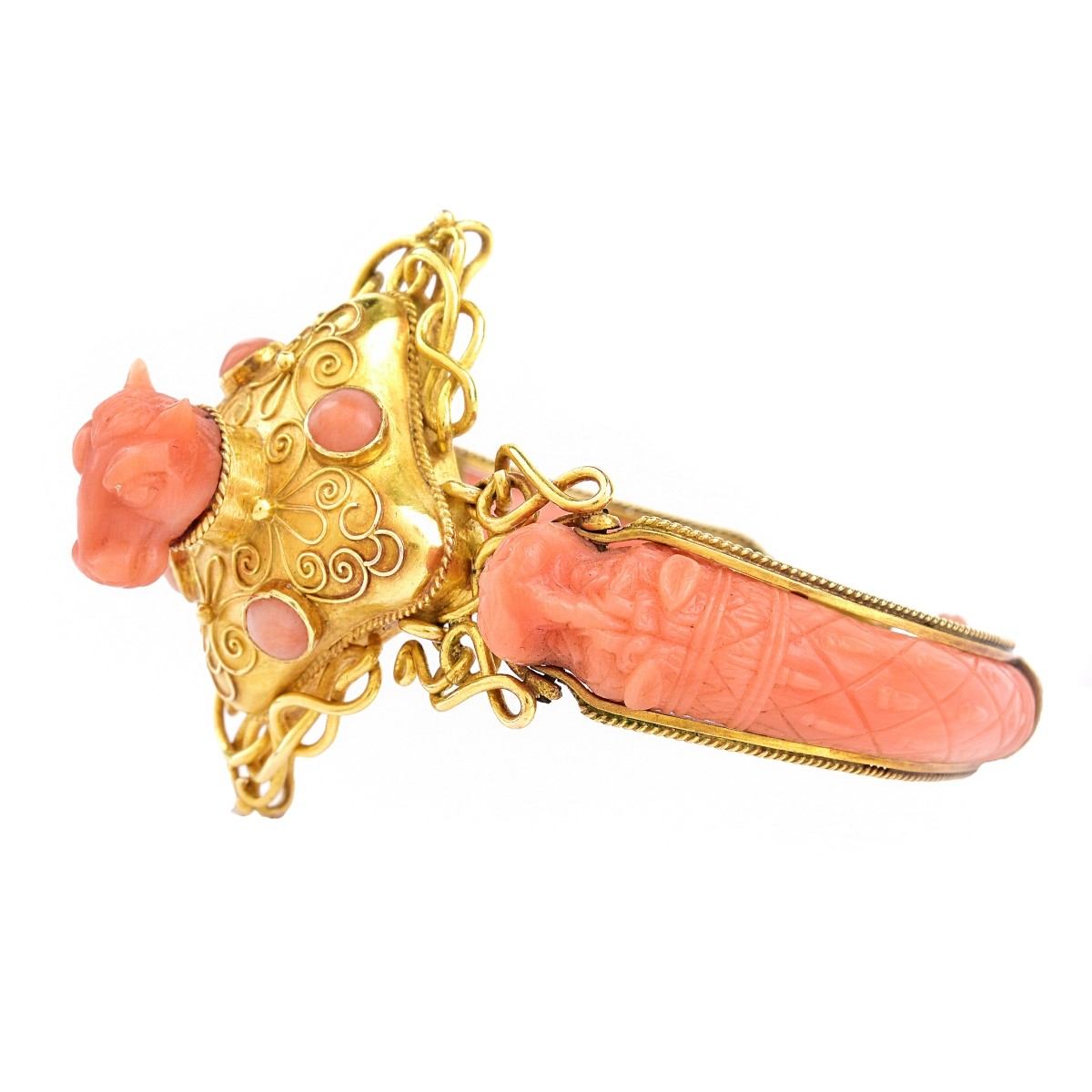 Circa 1900 Carved Red Coral and 14 Karat Yellow Gold Bracelet. Unsigned. Measures 1-7/8" interior diameter, 1-1/2" W. Approx. weight: 21.1 grams. Domestic Shipping: $30.00