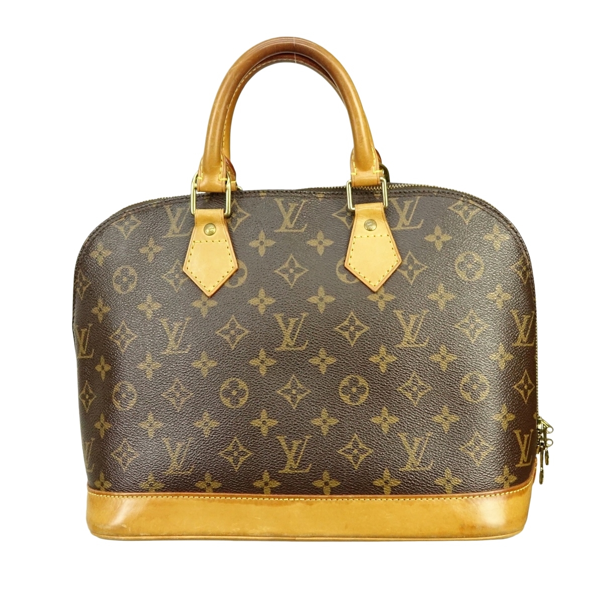Louis Vuitton Brown Canvas Monogram Alma PM. Golden brass hardware, brown interior with slot and patch pockets, vachetta handles. Dustbag included. Labeled appropriately. Serial #FL0043. Measures 12" x 9-1/2" x 6-1/2". Condition: Good pre-owned condition, with toning, wear and stains on vachetta from use. Domestic Shipping: $58.00 Min Est. $300.00 Max Est. $400.00