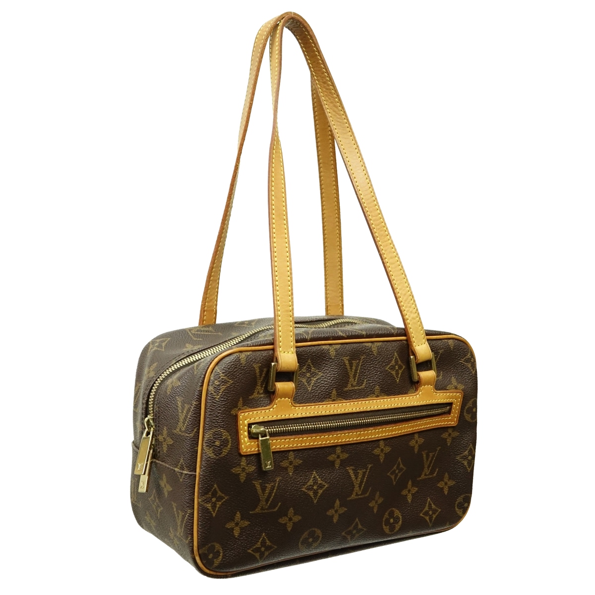 Louis Vuitton Brown Canvas Monogram Cite MM Bag. Golden brass hardware, brown interior with patch pockets, vachetta handles. Labeled appropriately. Serial #FL1012. Measures 10" x 6" x 4-1/4". Condition: Pre-owned condition with toning, light staining and wear on vachetta from use. Domestic Shipping: $56.00 Min Est. $350.00 Max Est. $450.00