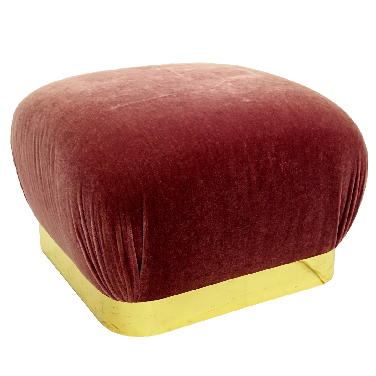 Karl Springer Brass and Mohair Ottoman with Concealed Castors. Unsigned. Measures 16" H, 24" square. Condition: Surface wear / scratches to brass, wear to upholstery. Domestic Shipping: Third Party. Min Est. $400.00 Max Est. $600.00