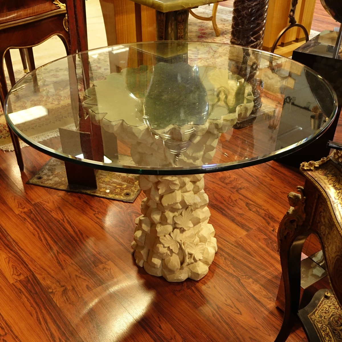 20th Century Grotto style Pedestal Table with Glass Top. Unsigned. Pedestal measures 28-1/2" H, 21-1/2" W; top measures 42" diameter. Condition: Good condition, minor scuffs to pedestal. Domestic Shipping: Third party. Min Est. $200.00 Max Est. $400.00